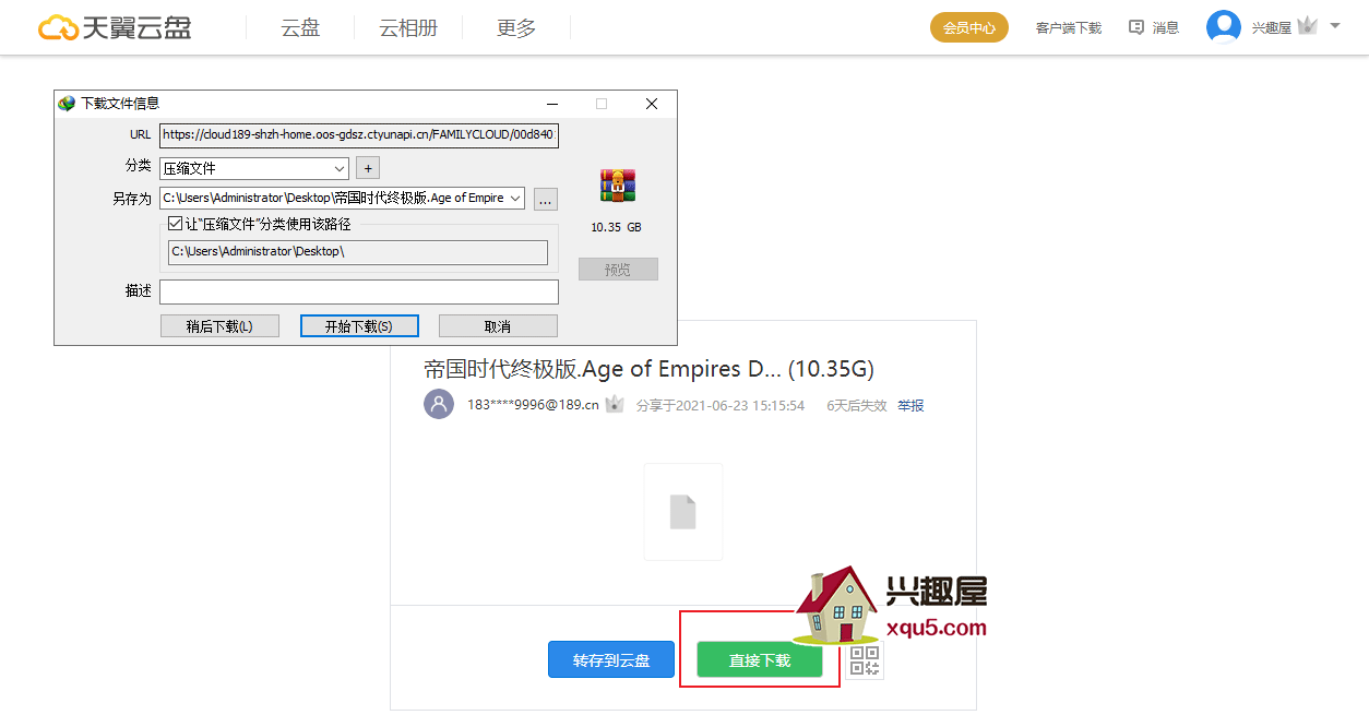 下面是屋主的测试。首先,屋主找到了一个天翼云盘分享链接,内置10G+的文件。打开后界面自动刷新,出现 直接下载 选项,点击直接下载就能够直接使用网页下载天翼云盘的内容。屋主因为安装了IDM,所以会唤起IDM下载器下载,速度基本跑满,非常快!