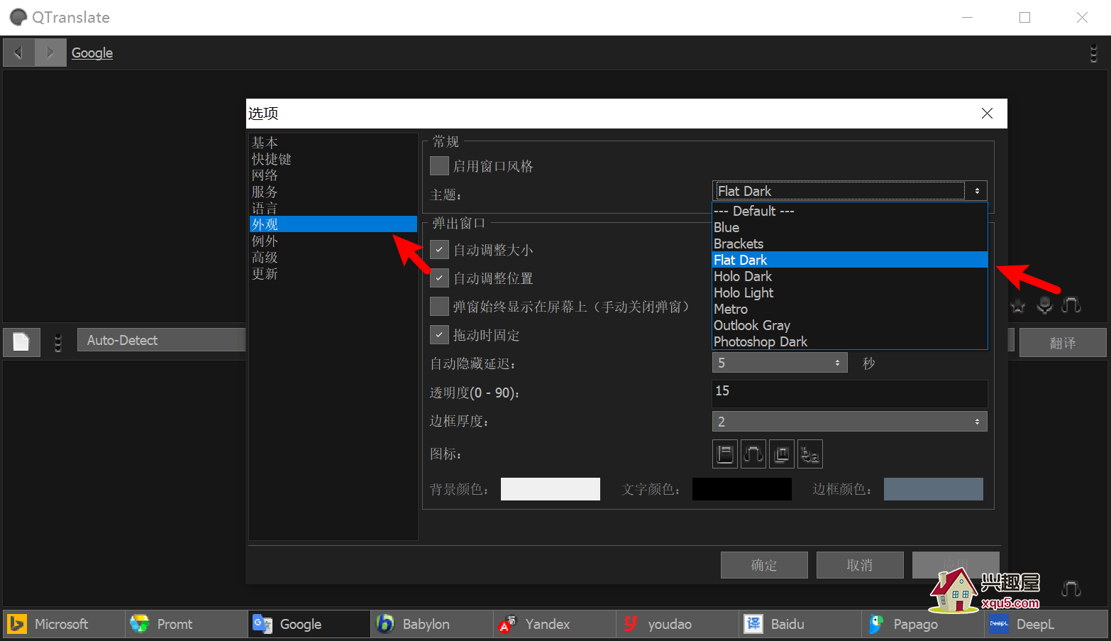 除了已经内置的词典外,如果你还想加入其他的词典,可以直接导入使用。QTranslate仅支持xdxf格式的词典,并且下载包内提供了一个Chinese-English dictionary,大家可以导入使用。如果你是夜晚使用,你还可以设置一下软件的主题色彩,可以将白色亮色、调整为暗黑色,这样方便不同的场景使用。当然,它的主题色远不止两种,如果你喜欢其他色彩,可以直接选择,保存一下即可。