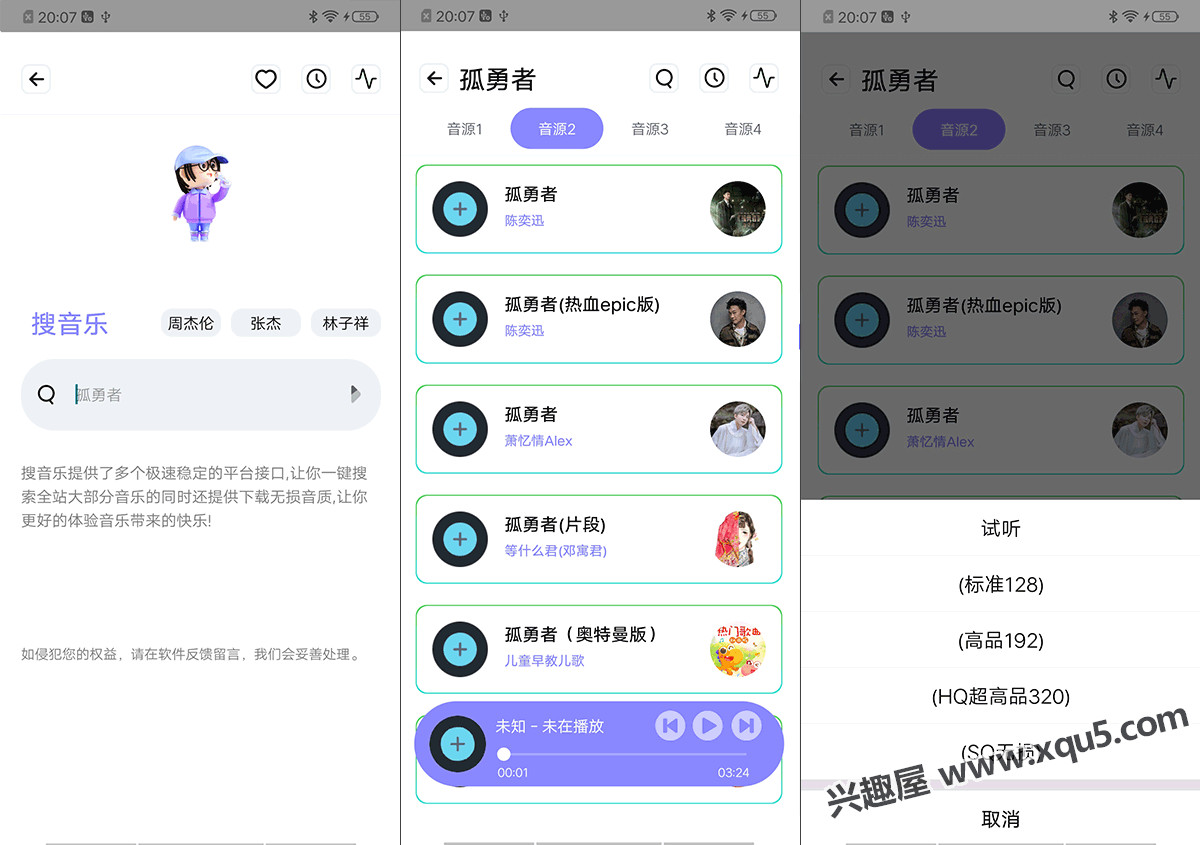 软件内置了五大音乐平台的资源搜索通道,输入歌曲名或者歌手名称,就可以快速搜索到大量的相关音乐。这些音乐有多种品质可以选择,甚至是无损音质!用户可以在线播放,也可以下载到手机本地存储保存。更厉害的是该软件还可以搜索MV边听音乐边看MV才更有感觉。