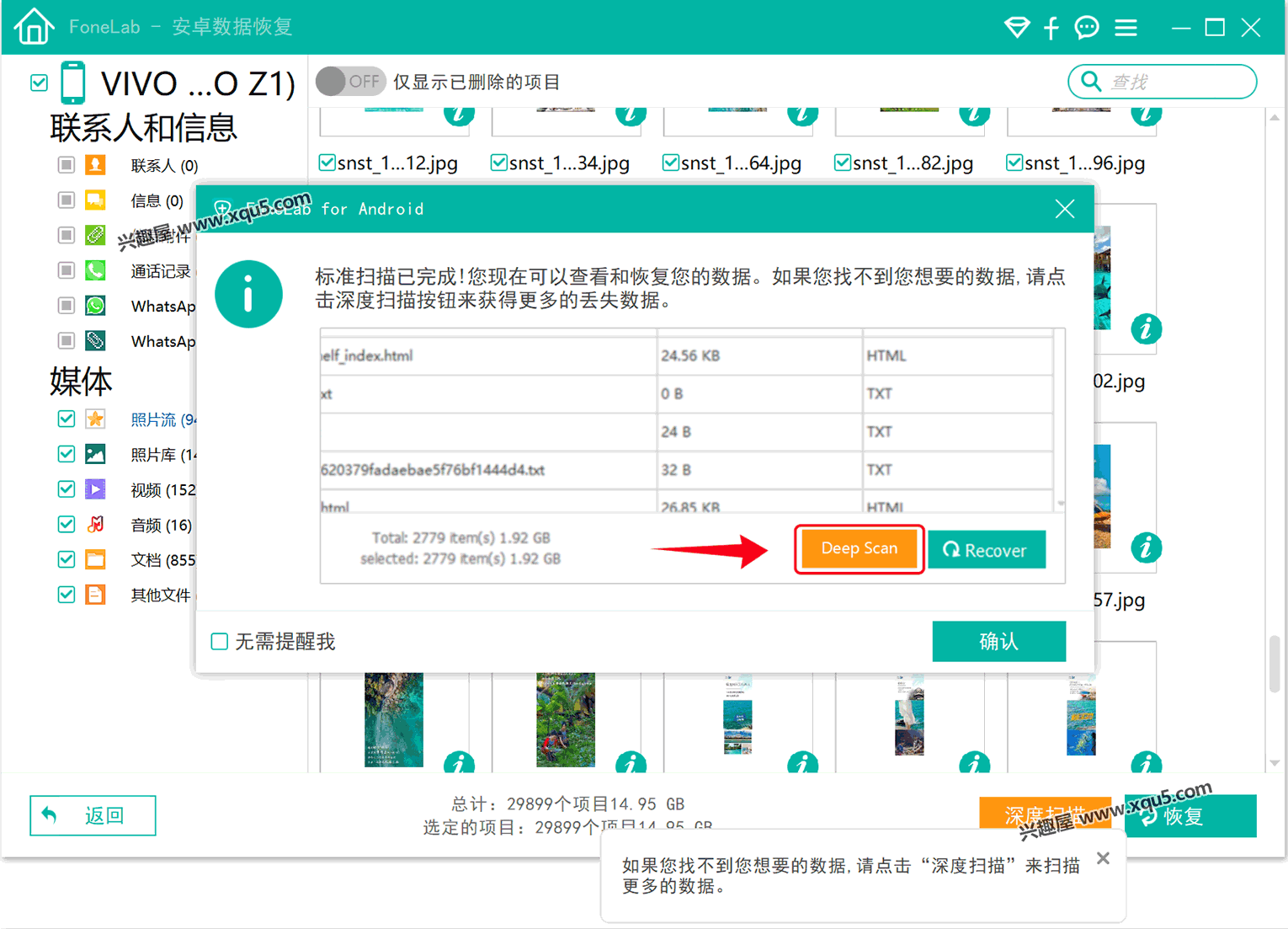 3. 找回删除丢失的音乐、视频、照片、WhatsApp和文档:无论是因为误操作还是其他原因,FoneLab都可以帮助你找回这些文件。
